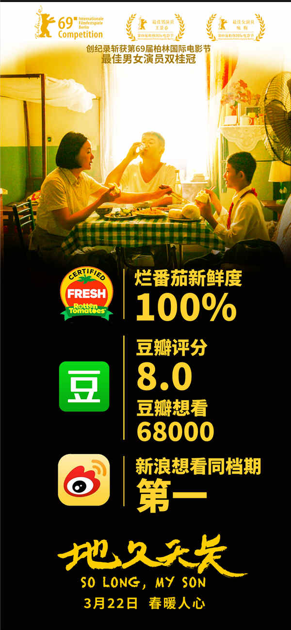 作为第六代导演代表人物,王小帅一直致力于描绘大时代下普通人的日常生活,新作《地久天长》被海内外影评人评价为王小帅的“集大成之作”,而近日各网站评分相继出炉,也佐证了这一赞誉。电影在海外知名网站IMDb上评分达到了7.6,在Metacritics上评分74,在烂番茄网站上的新鲜度更高达100%。海外满载荣誉,国内也热度不减,该片豆瓣评分8.0,在媒体档期想看榜单上期待值90.6,超过奥斯卡获奖影片《波西米亚狂想曲》,高居同档期第一。值得一提的是,海内外所有网站的评分都创了王小帅电影的新高。